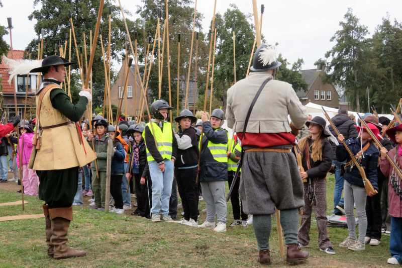 Piekeniers en musketiersBij het bivak, een tentenkamp op de krabbelbaan van de ijsclub, kregen de kinderen een korte opleiding tot piekenier of musketier. Af en toe moest de instructeur streng optreden als de discipline even verslapte. Eerst werden de basiscommando's van het marcheren geoefend. Op het open terrein van de ijsbaan voerden de piekeniers schijngevechten met hun pieken. De musketiers leerden alle handelingen die nodig zijn om een musket te laden en ermee te schieten (de loop was in dit geval een blaaspijpje). In het bivakHet bivak bestond uit een aantal eenvoudige tenten om de nacht in door te brengen. In enkele grotere tenten werden demonstraties gegeven van oude ambachten zoals houtbewerking en ijzersmeden. Eten werd klaargemaakt boven een houtvuur. Enkele belangrijk uitziende personen in prachtige kostuums toonden het interieur van hun tenten. Rond het middaguur waren de educatieve lessen voorbij. Stormachtige en zeer natte nachtDe weersverwachtingen voor het hele weekend waren ronduit slecht. Dit werd veroorzaakt door de storm genaamd Amy. De vrijdag verliep dus nog vrijwel droog. Maar later op de dag, avond en nacht ging Amy helemaal los met harde wind en veel regen. Van rustig slapen was geen sprake. De zompige veengrond veranderde in een modderige bende, met als gevolg dat alle activiteiten werden afgelast. Het bivak werd afgebroken en de kanonnen werden weer naar hun bergplaats vervoerd. Aangepast: 07-10-2025 12:50:19 |
