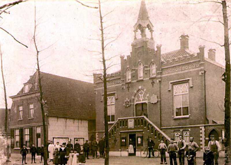 Twee gezichten van... Nr. 28: Gemeentehuis van Maasland Onder het bestuur van J.R. Thorbecke (1798-1872) kwam in 1851 de Gemeentewet tot stand. De gemeentewet was gebaseerd op de Grondwet, die drie jaar eerder van kracht werd. Daarin lag het beginsel van de gemeentelijke autonomie (het zelf besturen). In 1825 kreeg Maasland de eerste burgemeester: De titel van de toenmalige schout Petrus Coenraad de Coningh werd in dat jaar veranderd in burgemeester. De gemeenteraadsvergaderingen vonden van oudsher plaats in de dorpsherberg De Pynas. Burgemeester Adrianus van Heel, die in 1865 een groot pand op de Kerkweg (nummer 15) bewoonde, hield de gemeenteraadsvergaderingen en de secretarie echter liever aan huis. Voor dit doel richtte men dan ook een kamer in. Op voorstel van de burgemeester werden zelfs meubelen gekocht! De kantooruren werden gehouden van 10.00 tot 13.00 uur. Deze situatie bleek echter niet ideaal te zijn: het huis lag buiten de bebouwde kom en de beschikbare ruimte was te klein. In 1873 besloot Maasland tot de bouw van een gemeentehuis op de 's-Herenstraat. Er werd een geldlening aangegaan van f 25.000,-- voor de aankoop van grond en de bouw van het raadhuis. 'Er bood zich de gelegenheid aan tot aankoop van een groot, doch in verval zijnde gebouw, staande op een voordeelig standpunt in het aanzienlijkste gedeelte van de gemeentekom'. Dit gebouw werd afgebroken en door ruiling van enige percelen grond kon de benodigde oppervlakte voor het nieuwe gemeentehuis worden verkregen. Op 20 juli 1874 kon het Maaslandse raadhuis officieel geopend worden. | | Veel mensen en kinderen staan voor het oude gemeentehuis (1910). Als de fotograaf in het dorp kwam, kon hij rekenen op veel bekijks. We zien jongens op klompen en met petten op het hoofd. Een jongen staat er prachtig bij in zijn matrozenpak. De meisjes dragen allemaal schorten over hun jurken. Links staat de veldwachter, de bewoner van de benedenverdieping, waarschijnlijk is het zijn dochter die in de deuropening staat. Ook enkele knechten en vrouwen zijn komen kijken naar wat de fotograaf aan het doen is.